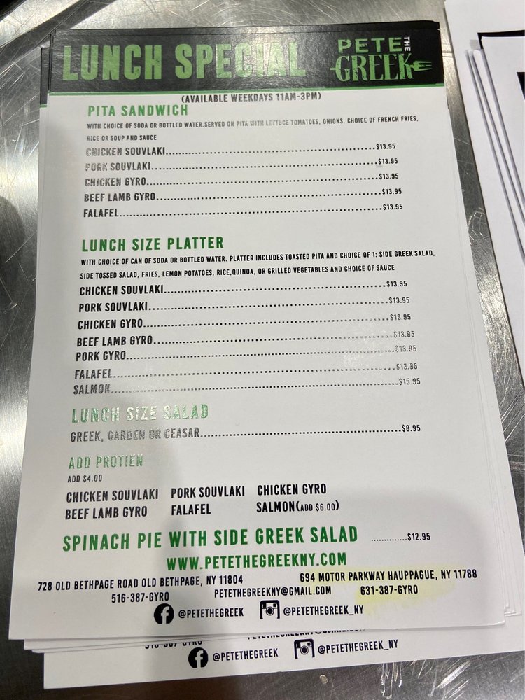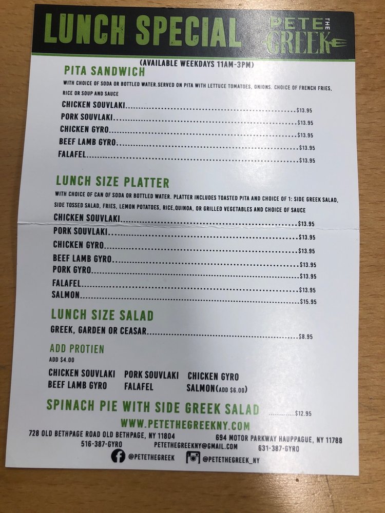 Welcome to Pete The Greek - Hauppauge, where Mediterranean flavors meet cozy, casual dining. Nestled at 694 Motor Parkway, this gem specializes in wraps and Greek cuisine, offering a delightful array of dishes that promise quality and freshness. The menu boasts classics like the Horiatiki salad and hearty wraps, including customizable options that cater to every palate. Customers rave about generous portions, ensuring you often leave with leftovers—perfect for that second lunch!
